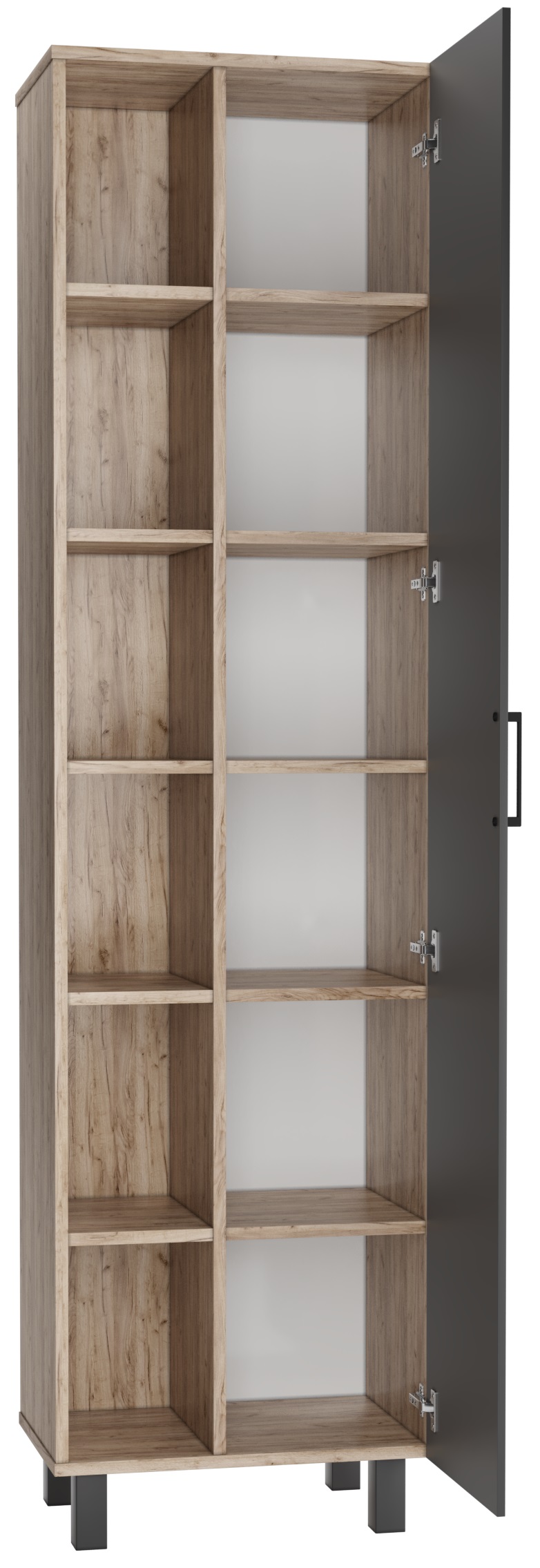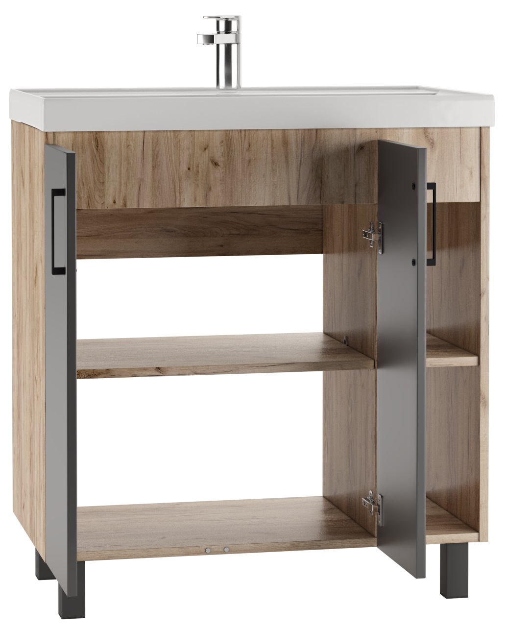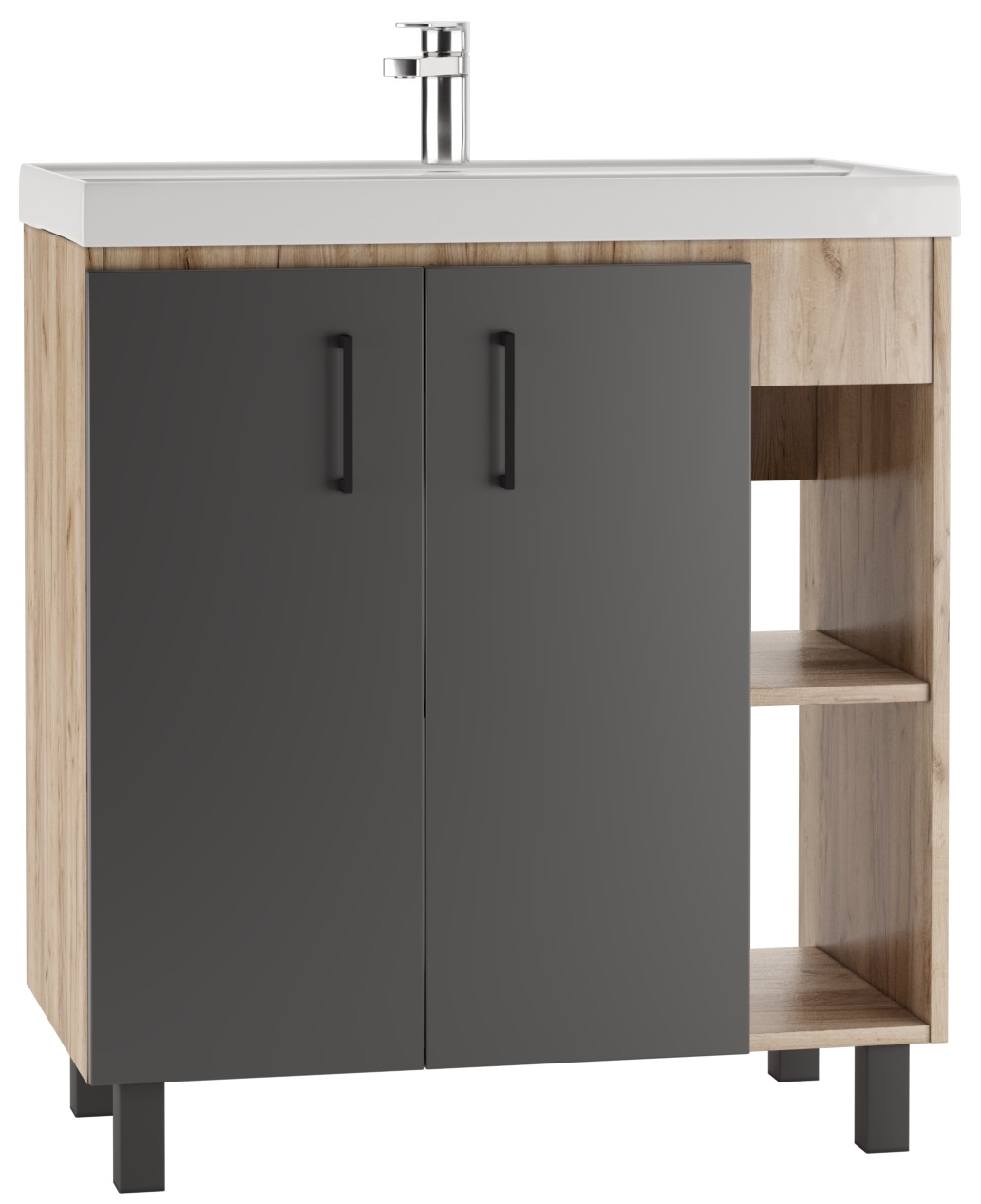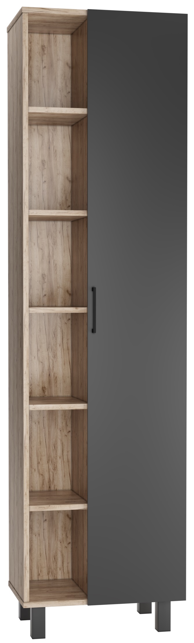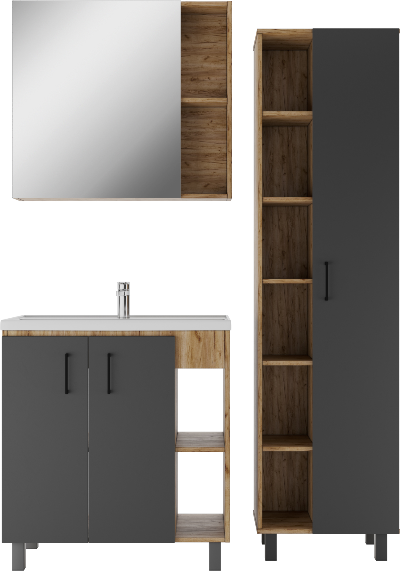 Серия CRAFT с эксклюзивным дизайном подойдет для лаконичных и элегантных дизайнов ванной комнаты. Корпус серии представлен в цвете «Дуб вотан» и выполнен из ЛДСП. Фасад из ЛДСП, покрыт пленкой ПВХ, цвета графит. Фурнитура черного цвета. Размерный ряд от 45 см до 100 см в ширину. Шкаф-зеркала универсальные и могут открываться как в левую, так и в правую сторону. Тумбы под умывальник «ФОСТЕР», в зависимости от размера представлены с одной/двумя дверцами и полками с правой стороны. Пенал напольный, без ящика, 50 см в ширину, имеет пять полок. У тумб и пенала возможна регулировка ножек до 30 мм. Для удобства в использовании, на дверцах установлены доводчики. Мебель поставляется в собранном виде. Все элементы отличаются практичностью и комфортностью.