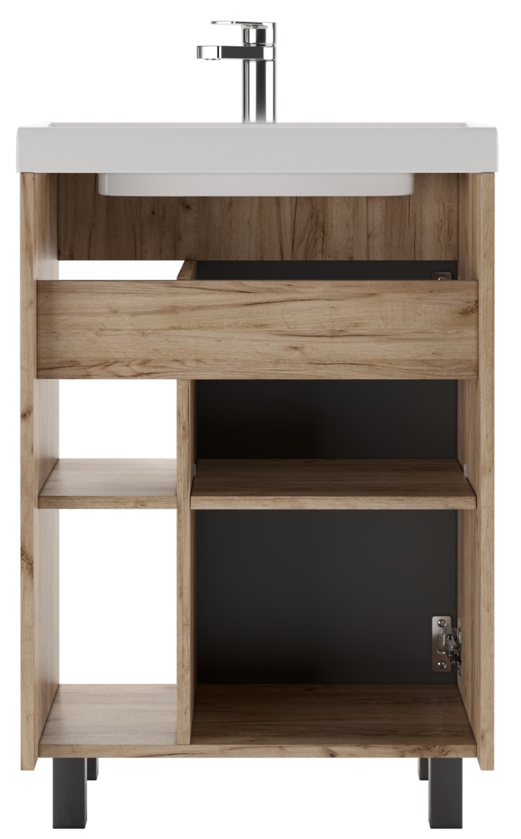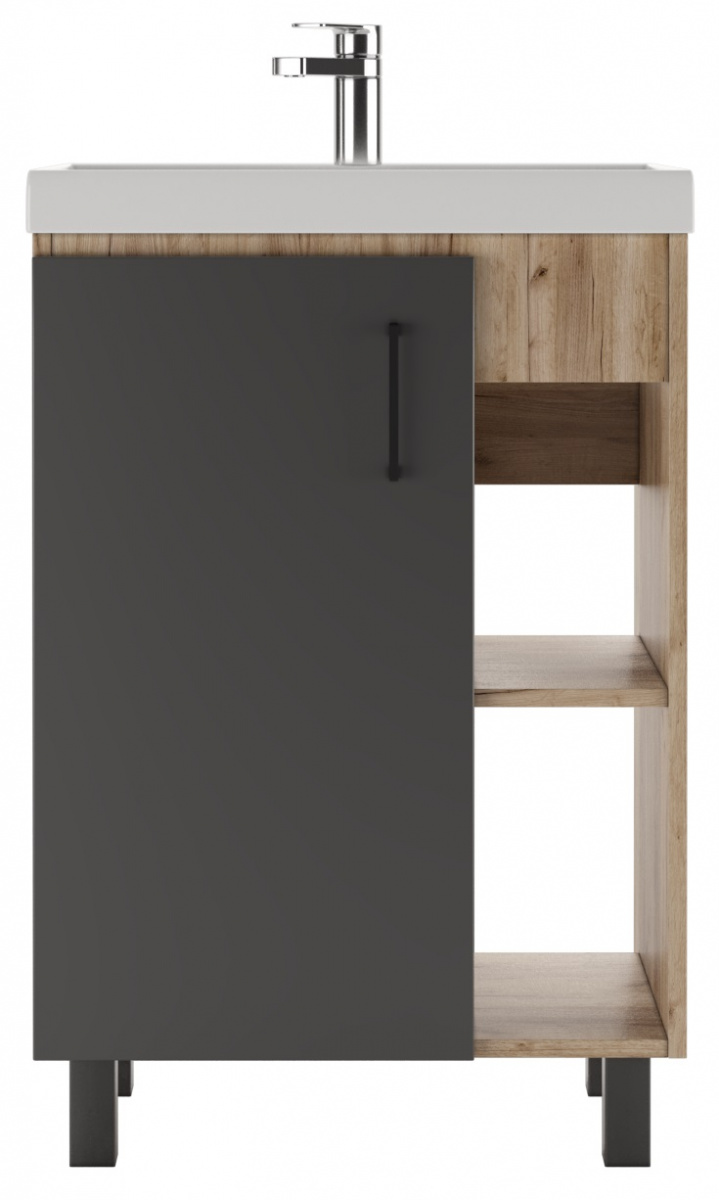 Серия CRAFT с эксклюзивным дизайном подойдет для лаконичных и элегантных дизайнов ванной комнаты. Корпус серии представлен в цвете «Дуб вотан» и выполнен из ЛДСП. Фасад из ЛДСП, покрыт пленкой ПВХ, цвета графит. Фурнитура черного цвета. Размерный ряд от 45 см до 100 см в ширину. Шкаф-зеркала универсальные и могут открываться как в левую, так и в правую сторону. Тумбы под умывальник «ФОСТЕР», в зависимости от размера представлены с одной/двумя дверцами и полками с правой стороны. Пенал напольный, без ящика, 50 см в ширину, имеет пять полок. У тумб и пенала возможна регулировка ножек до 30 мм. Для удобства в использовании, на дверцах установлены доводчики. Мебель поставляется в собранном виде. Все элементы отличаются практичностью и комфортностью.