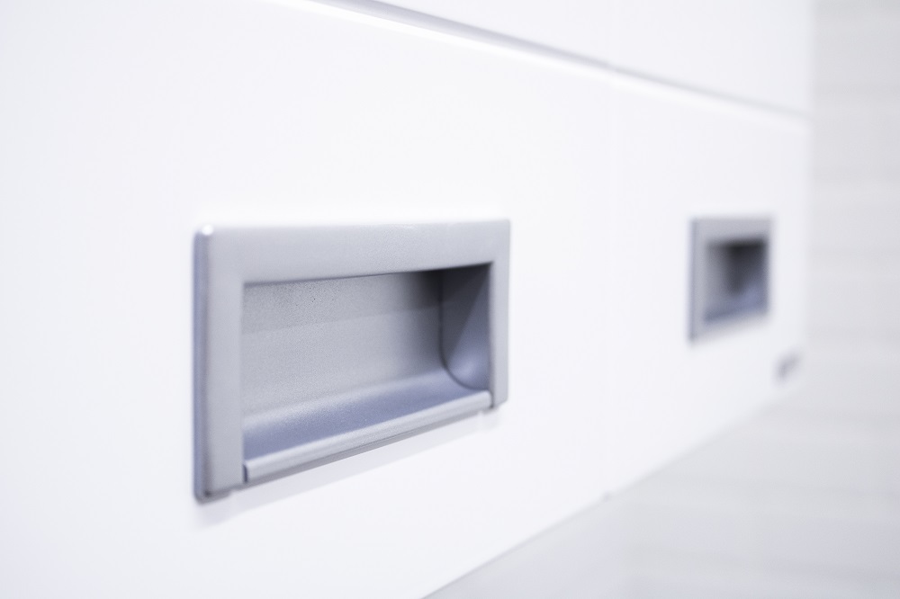 Ручка врезная пластиковая выполняет не только декоративную, но и функциональную роль. Она удобна в эксплуатации и гармонично смотрится на фоне белого глянцевого покрытия. Такой шкафчик делает вашу ванную более стильной и функциональной.