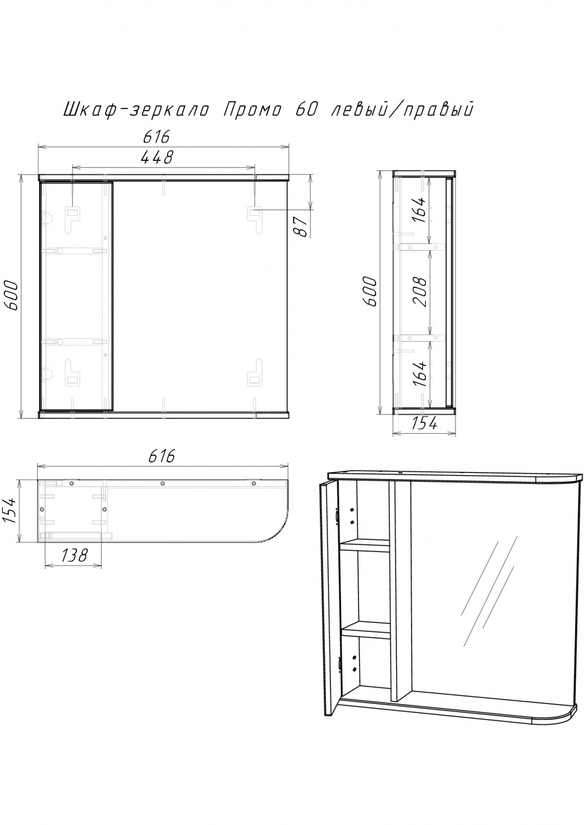 Шкаф-зеркало Промо 60 левый/правый для ванной предназначен для тех, кто ценит порядок и комфорт. Внутренние полки позволяют разместить все необходимые туалетные принадлежности на своих местах, обеспечивая легкий доступ к нужным вещам. Шкаф с полками способствует эффективному использованию пространства, а сам корпус создает уют и стиль в вашей ванной комнате.
