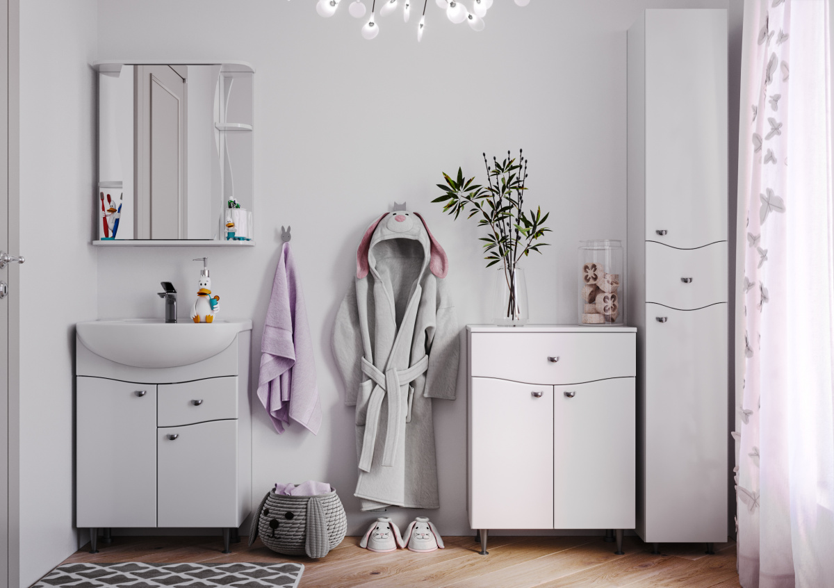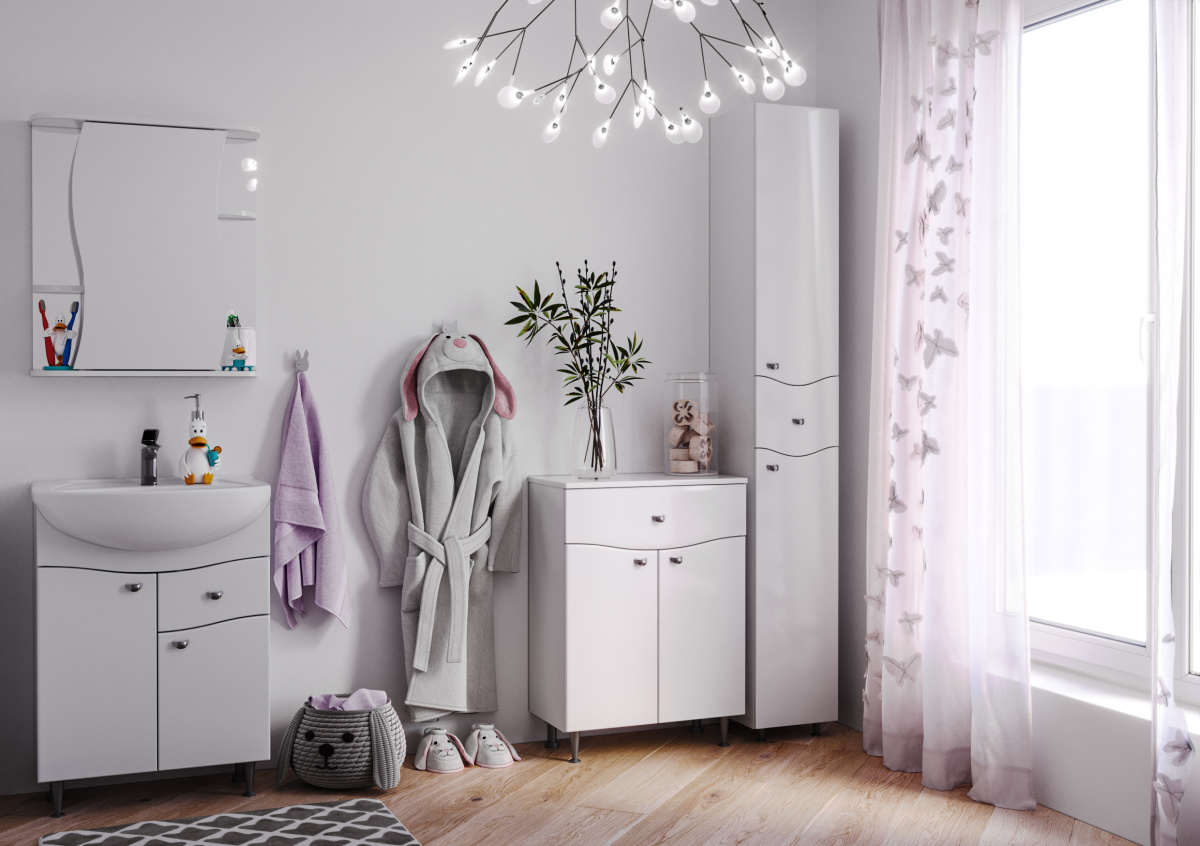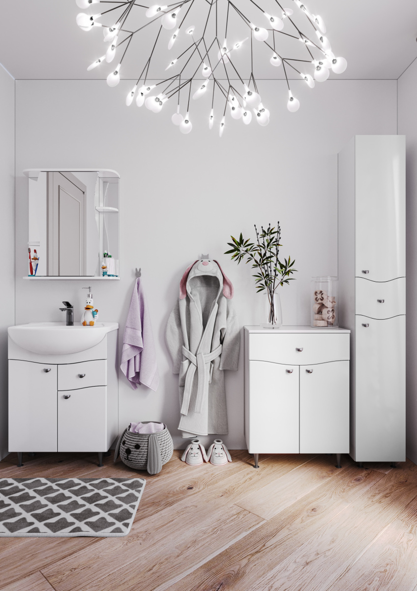 Мебель в ванную комнату изготовлена из высококачественного ЛДСП и МДФ, обшита ПВХ пленкой, что делает её долговечной и стойкой к повышенной влажности. Напольная конструкция позволяет легко устанавливать тумбочку под раковину в необходимом месте без сложных монтажных работ.